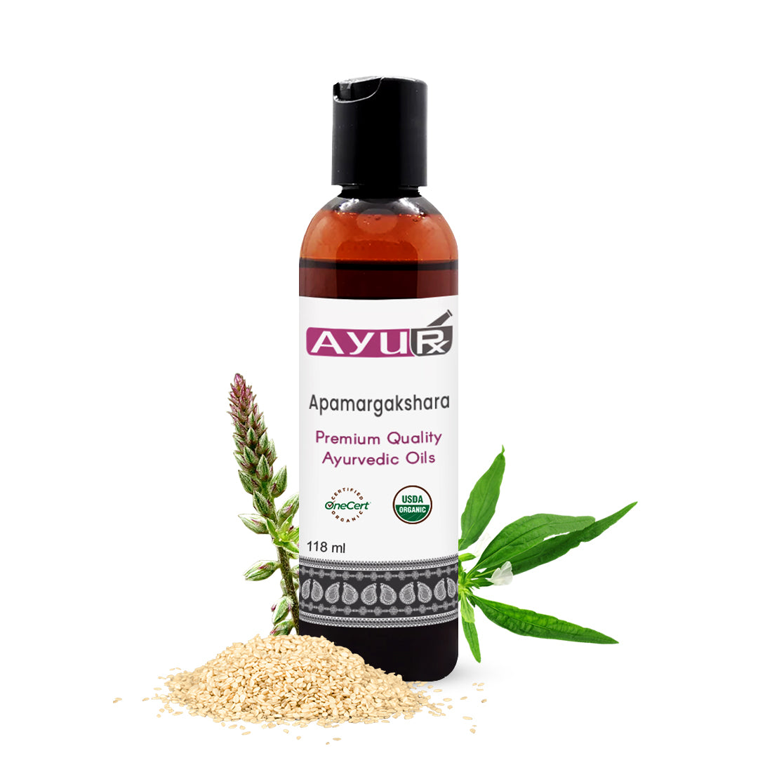 Apamargakshara Oil is a potent Ayurvedic medicated oil prepared using the Kshara (alkaline extract) of Apamarga (Achyranthes aspera) infused in Tila Taila (Natural Sesame Oil). It is specially formulated for external use in chronic skin conditions, musculoskeletal pain, and Vata-Kapha disorders.